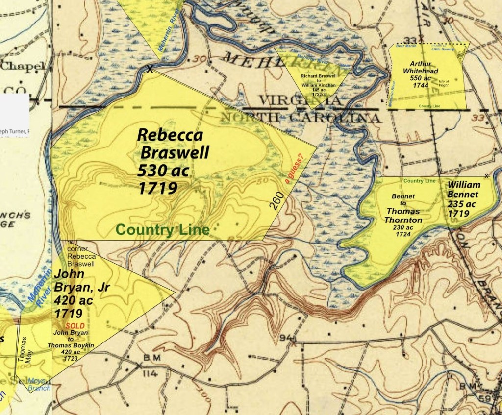 - 9 Mar 1746, Thomas and Martha Thornton of the County of Northampton NC, to Chaplin Williams of IOW, 230 ac, formerly granted to William Bennett, 1 Mar 1739, joining the old county line, N side of Meherrin River. Wit: John Pitman, Arthur Pitman, Daniel Bensten, Thomas Mansene/Manpene. FHL Film # 007517521, image 135/527 (p. 258).