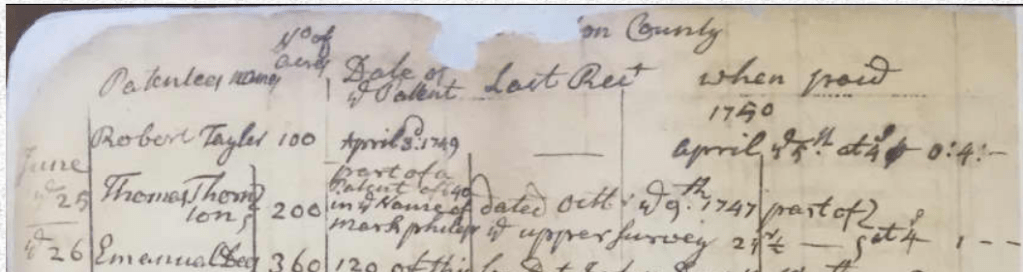 This no longer existing deed appears to be supported by the 1750 Quit Rents of Johnston County, NC. June 25, Thomas Thornton, 200 acres, part of a patent, 640 [acres], in “ye” name of Mark Philips, dated Oct 9th 1747.
